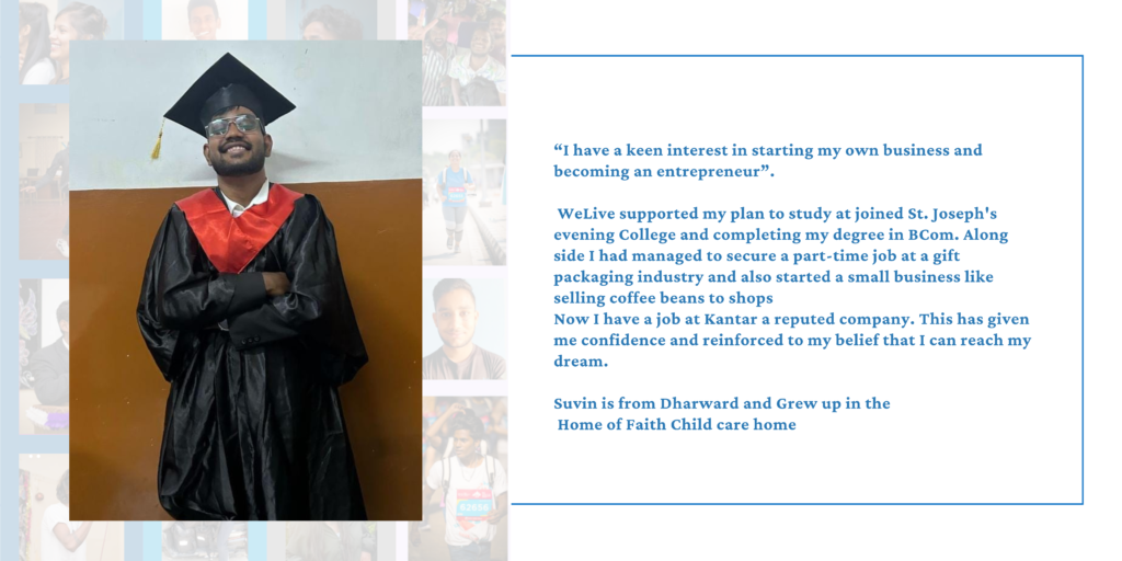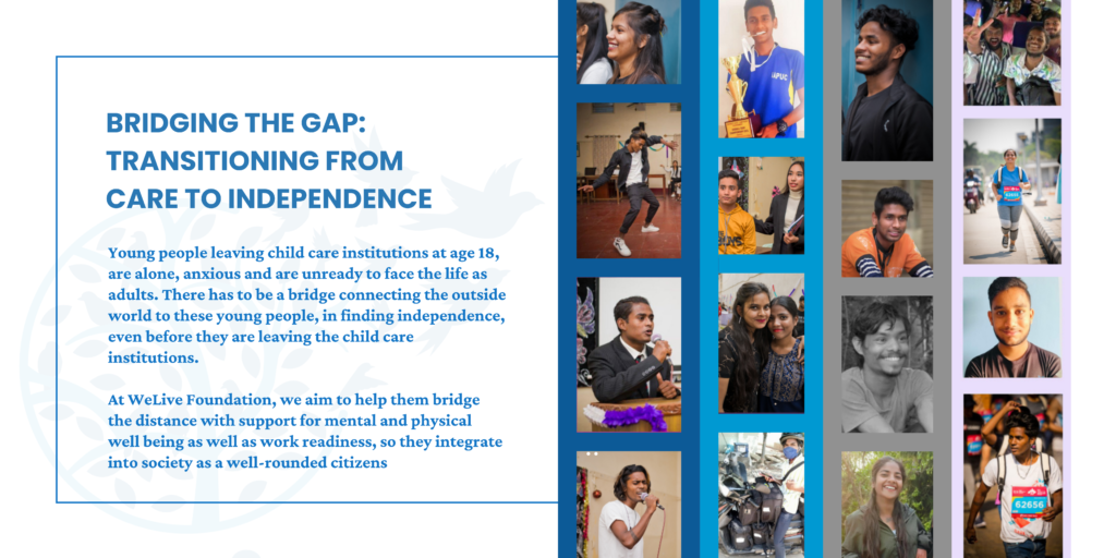 With an incomplete education of 10th/12th/graduation, no job/skills/experience or money in hand, no family/social support and lacking identity documents, care leavers are left to figure out where to sleep at night and how to ensure they eat enough to survive. WeLive Foundation has been working with care leavers since 2019 through residential and non-residential bridge programs designed to aid them in their transition from care to autonomous adulthood.