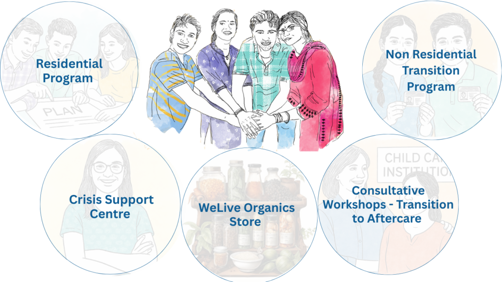 This program is for youth in 16-18 years in childcare institutions (orphanages/shelter homes) across the country. The objective of the transition program is to equip youth in 16-18 years, who are in the institutions, with exposure visits and workshops that will give them the knowledge to transition from institutional care to independent living. This is conducted in online/offline format over a period of one year through modules in career guidance, financial literacy, cyber safety, gender & sexuality, spoken English, emotional well-being and more. The culmination of the year-long engagement will end in WeLive supporting the next steps of the youth who will step out at 18 years to start independent living.Â